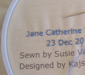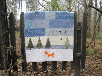 In the fall of 2011, a book caught my eye. It is Scandinavian Needlecraft and includes great embroidery designs, mostly on wool. The book wasn’t in our library system at the time, so I tried Scandinavian Stitches instead. Author Kajsa Wikman has lots of great designs in it, including soft baskets and stuffed fabric birds. I loved one of the baby quilts in the book, but I wasn’t about to make a quilt just to hang on the wall. It occurred to me that Jessie was having a baby in December and the quilt has lots of blue in it (a color that she might not see enough of these days). A winter theme, lots of blue, and a December baby…a perfect combination.