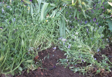 There is another type of rose in the same garden. It self seeds everywhere! The unsuspecting plant lady got one of them, and these violas lost the support that it provided.