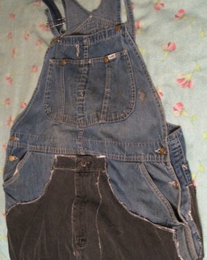The crotch was torn (speed trip through the barbwire?) and the knees were worn out in the bibs. Also George didn’t like the button fly. He mumbled something about them being too breezy. What to do? Sew the good parts off a pair of worn jeans onto the bib tops and ta-da: Frankenpants!