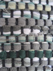 An upcycling project that I had been considering was to make a rug from old t-shirts. The process of cutting the strips held me back, even though I use a rotary cutter. Enter one of my favorite thrift stores, The Clothes Closet of Hettinger, North Dakota. I purchased two latch hook rug canvases, fabric strips, and a latch hook tool for one dollar! One rug was started, with a fabric strip for each “hole” in the canvas. It was bunched-up, but I thought that might be due the small size of the started rug. I added more strips. It didn’t get better. I took apart the rug and washed the fabric strips in a lingerie bag. The washing made the fabric curl up and easier to latch to the canvas. The Crafty Woman blog has detailed instructions on how to make a jersey rug and spacing the strips made the rug much easier to hook and it laid flat right away. The fabric strips that I used are 3/4″ wide by 6″ long.